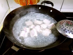 排骨用清水提前清洗浸泡。锅入适量水,倒入一勺料酒,水烧开后放入排骨过一下水去除血水和腥味。