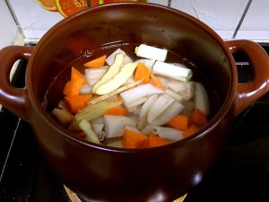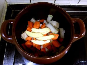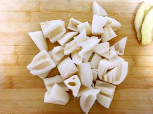 把胡萝卜和莲藕块放入坤博砂锅内。再放入葱段和姜片。
