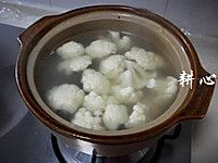 将花椰菜择洗干净,切朵,放入盐水中浸泡30分钟,冲洗一遍,沥干。