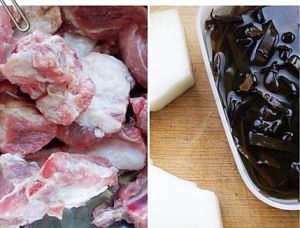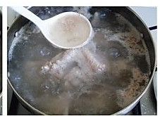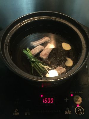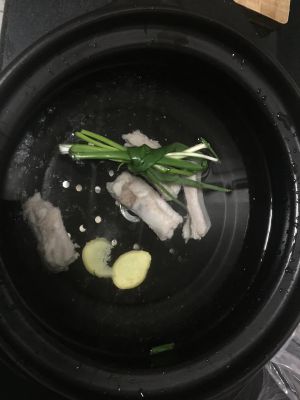 排骨用清水泡2小时后。 大火去血水后捞出用清水冲洗干净。砂锅中加够足量的水放入排骨、姜片、香葱。
