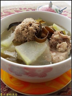 排骨剁成小段,洗净;冬瓜去皮去籽,切成厚片;海带切成丝