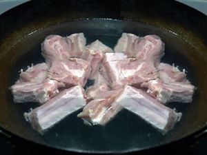 排骨冷水下锅,加入20g料酒,不要盖盖子,否则异味散发不出去,同时烧一锅开水。