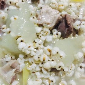 将洗干净的排骨和浸泡过后的薏米放入锅内,加水没过排骨薏米,小火慢炖50分钟。