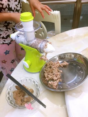 将煮好的肉放入果语原汁机(去头)摇出肉丝