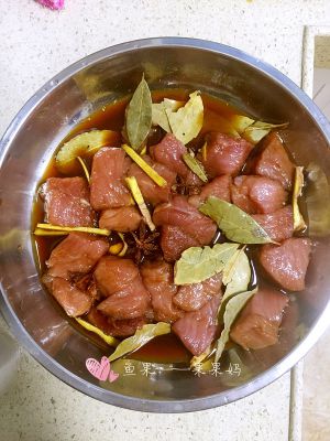 在切好的肉块里倒入料酒、酱油,放入八角、香叶、姜丝、白砂糖,用手抓匀后放置冰箱冷藏腌制12小时。