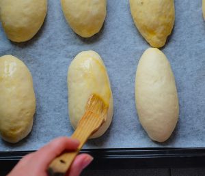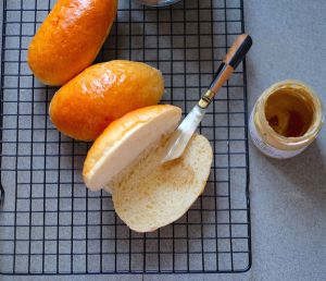 面包出炉后,晾至微热后,横剖开,涂上沙拉酱。