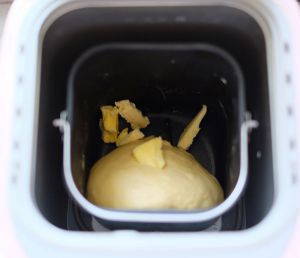 待面团搅拌至表面光滑时,加入黄油,继续用“自动和面程序”和面,搅拌至面团表面光滑细致。