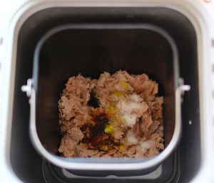 把敲碎的肉丝放入面包机的内桶中,加入所有调味料,略拌匀。