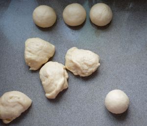 将面团取出,用手轻压排出大气泡,并平均分成8等份。