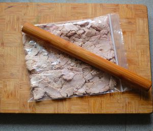 将晾凉后的肉块装入一个大保鲜袋,用擀面杖把肉块敲打碾压碎。