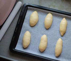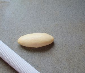 将松驰好的面团擀成牛舌状,折3折,收口处捏紧,搓滚成梭形。