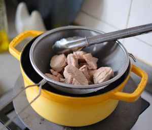 铸铁锅中加适量水、姜片,沸腾后放入飞过水的肉块,并加入花雕酒,转小火煮到猪肉用筷子一压就散开的状态,捞出过滤晾凉。
