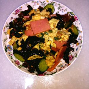 热油爆香葱姜蒜、依次放入黄瓜、午餐肉、木耳,再倒入适量生抽搅拌,放入调料搅拌均匀,最后加入炒好鸡蛋,搅拌出锅!