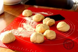 把面团放在面板上,撒一点干面,均匀分成8个小面团。