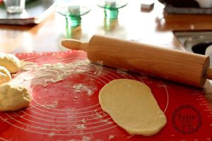用擀面杖把小面团擀成长椭圆形,大概1厘米厚。