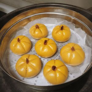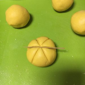 把揉圆的面团稍稍压扁一点,用牙签在在上面压出南瓜纹路,在顶部放上枸杞做瓜蒂