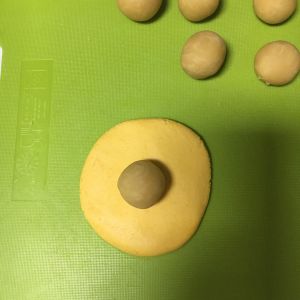 面团均匀等分成40g左右,馅料等分成10g左右,面团揉圆压扁,像包汤圆一样填入馅料,再揉圆