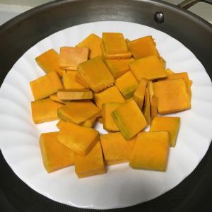 南瓜去皮,切片,上汽后放蒸锅里大火隔水蒸6、7分钟至软烂