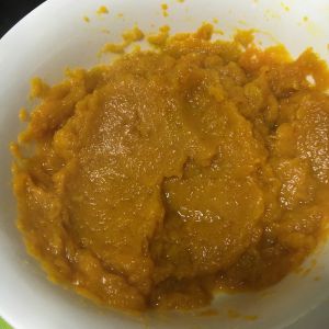 将煮熟的老南瓜捣烂并放入白糖(按个人口味决定白糖量的多少)待其凉