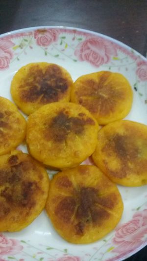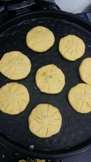 南瓜熟后用勺子压烂稍微放凉先加练乳再加粉,揉成面团,然后揉成圆形压扁,双面刷上玉米油,放入烤盘。。