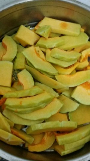 南瓜去皮,小块隔水蒸熟,大约20分钟。