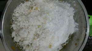 把糯米面 白糖 烫好的小麦淀粉放进搅好的南瓜里。白糖按照自己的口味添加!爱吃甜的多放点!