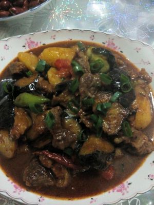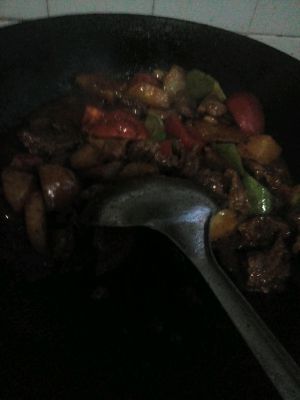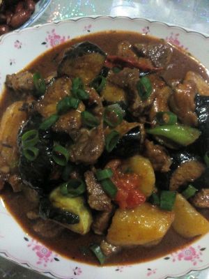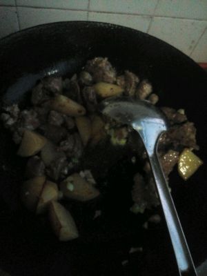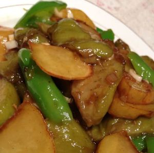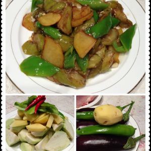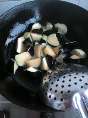 茄子出锅,留少量的油在锅里,放入辅料葱蒜等,翻炒后放入炸熟的土豆茄子,加调料,在加入适量的水炖菜,待菜快出锅时拌入淀粉,成品汁更浓