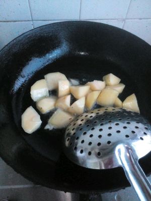 向锅里倒入适当的油,待油热时放土豆,土豆外皮焦黄时捞出(根据个人喜好决定油炸的程度)