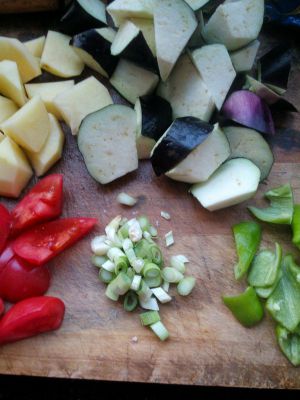 加入葱花,蒜末爆香,加入一勺辣酱,依次加入土豆,西红柿,辣椒,茄子,盐翻炒,加入水或高汤,微炖。