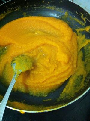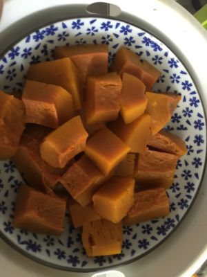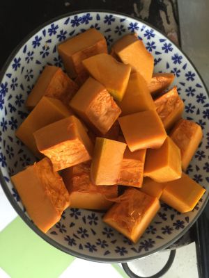 南瓜切粒加点水用料理机打成泥(配方是处理好的重量了),倒入锅中煮熟。