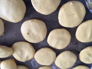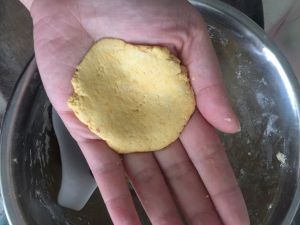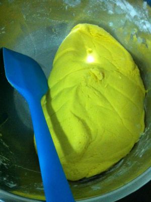 蒸好后冷却,加入糯米粉,白糖中,一起和面。太湿可以再加点糯米粉,太干可以加点水。
