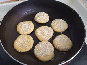 轻点压面包糠,要把面团都嵌入,就不会糊了