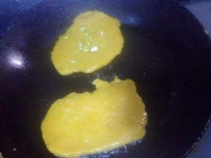 平底锅热锅,放油,用筷子夹适量的面团进锅,放入一些小葱,一面煎好后,翻面,两面煎好后出锅。