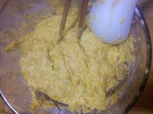 倒入小麦粉,小麦粉要一点点加,因为南瓜是隔水蒸已经有很多水分了,不需要加水,面糊搅拌后,用筷子能够夹起来不会掉的时候,就差不多了,因为南瓜糖分较多,对于一般的人而言甜度应该是刚刚好,不需要加糖