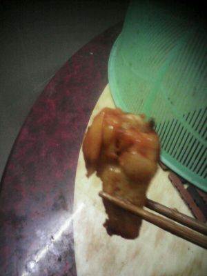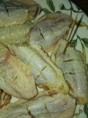 把鸡翅从腌制的酱油里面取出,剔除大蒜。