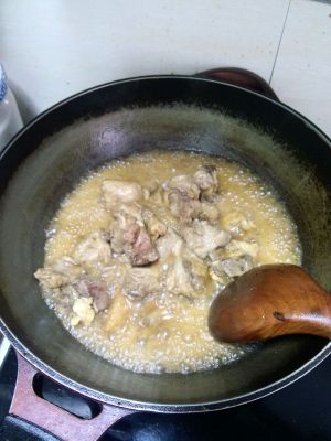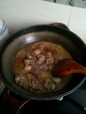 倒入料酒,生抽翻炒下之后加入4小碗水,没过排骨之后改中火加盖子焖煮