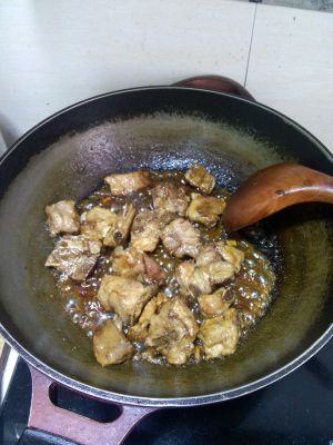 到水分收干至2/3的时候加入糖,最好是冰糖上色,翻炒,加入黑醋,继续翻炒