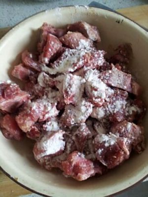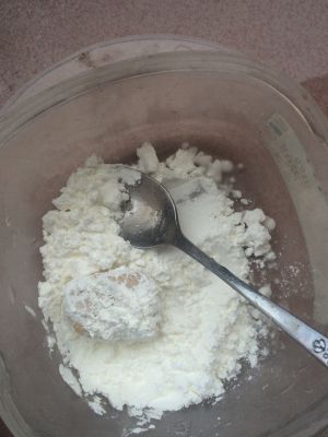 放淀粉,把排骨四周都弄满淀粉,我是一个个排骨弄好的,怕麻烦的可以用盘子几个或者一盘子弄