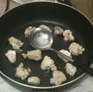 锅内倒油,排骨连同姜末蒜末入油炸至微焦。捞出。