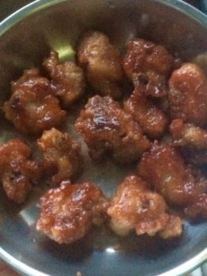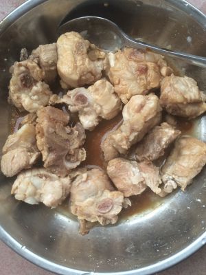 另起锅,放入酱油 水 白糖 稍加一点红糖 醋,在不断烧的时候,尝一下味道。导入小排,不断翻炒,等水快干的时候,加入淀粉水,出锅。