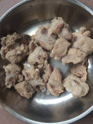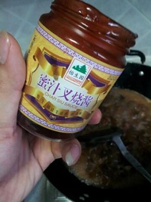 加没过排骨的清水,倒入适量叉烧酱~大火水开后转中火~倒入适量白醋~待汁水收干。