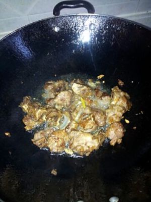 肋排炒至金黄后,加入黄酒,等酒气挥发后,分别加入酱油,冰糖,水和糖。