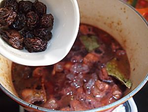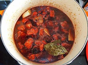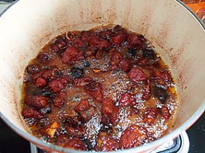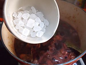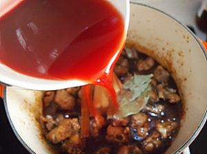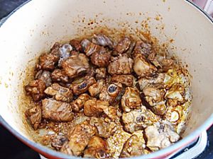 加入适量的红曲米浸泡的水,微微没过排骨即可。