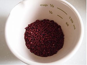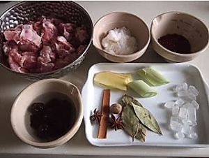 红曲米用来上色,可多可少。红曲米放在一个大碗中,浸泡适量的清水,水量用来炖排骨的量即可。