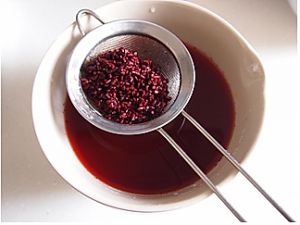 浸泡20-30分钟,只要汤色变红,即可用漏网过筛一下,去除固体,留下液体。