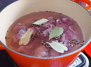 锅中加足量冷水,放入排骨、葱姜、槐角、香叶、料酒一同煮开后。