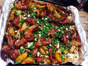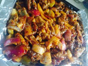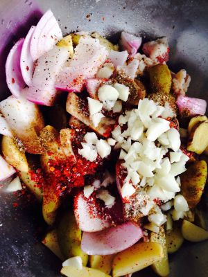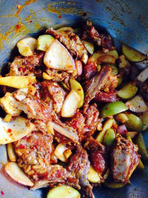 土豆洋葱切块 羊排顺根切条 加一袋烧烤酱(说明上一袋约腌制一斤左右 我淹了二斤多羊肉 自己放了一点点盐已经很咸了 大家自己根据自家情况哈) 耗油 黑胡椒 一点点盐 一点点蜂蜜 料酒适量 抓匀腌制一晚