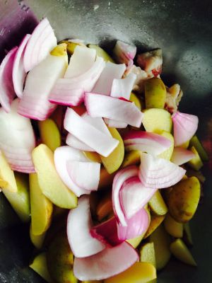 土豆切成角,洋葱切块儿和羊排放在一个容器里,加入三勺盐拌匀,腌制10分钟