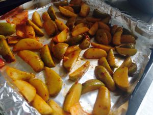 腌制后,烤箱预热上下火220度,烤盘铺上锡箔纸,先把土豆角均匀铺在最下面一层