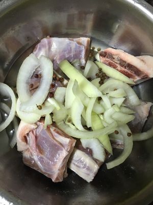 把羊排放进容器中,冷水浸泡至少10分钟,把血水倒出